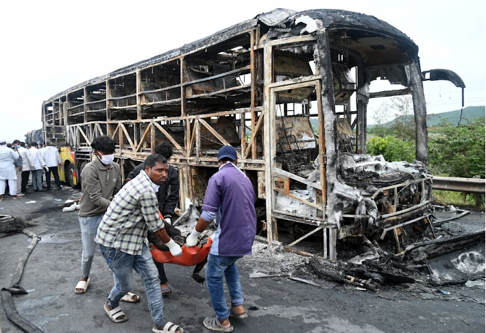 Según la Policía, el desafortunado autobús, que viajaba de Hyderabad a Bengaluru con 42 pasajeros a bordo, se incendió inmediatamente después de la colisión.