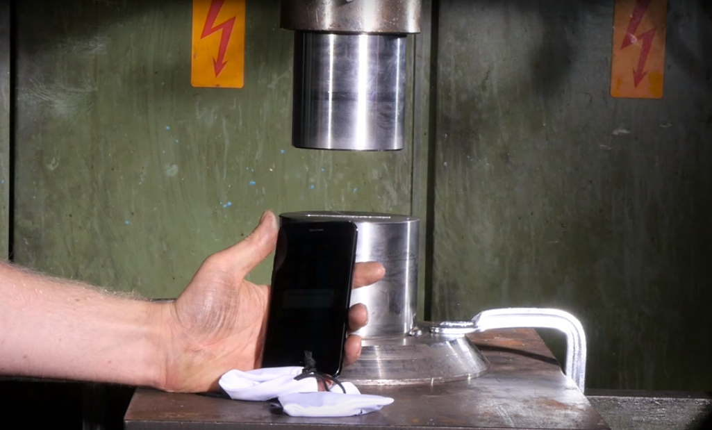 Esta vez en el juego ha entrado el ‘gran destructor’ la prensa hidráulica. El pobre ‘smartphone’ no resiste ni un minuto y casi desaparece bajo la presión.