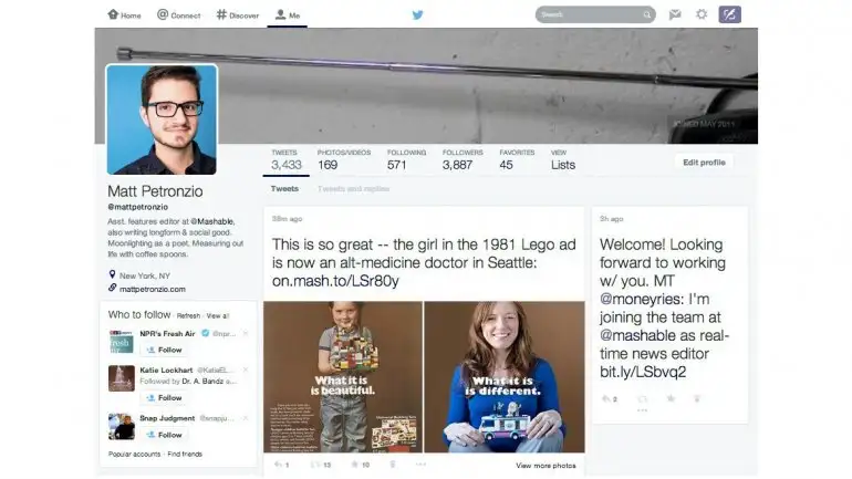 En este nuevo ensayo, la red de microblogging muestra en el perfil del usuario un recuadro con su foto sobre la izquierda ubicado sobre una gran foto de portada, que se extiende sobre el extremo superior de la página, según informó la web Mashable, uno de cuyos editores estuvo entre los usuarios sobre los que Twitter realiza la prueba. Esta disposición recuerda a la de los perfiles de Facebook, que muestra una disposición muy similar.