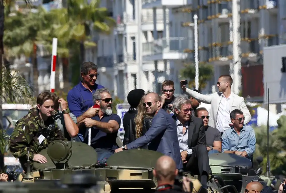Cannes se convirtió hoy en una locura con la llegada de dos tanques que fueron recibidos por cientos de personas que se arremolinaron inmediatamente al ver que desde su techo saludaban Harrison Ford, Sylvester Stallone, Arnold Schwarzenegger, Mel Gibson o Antonio Banderas.