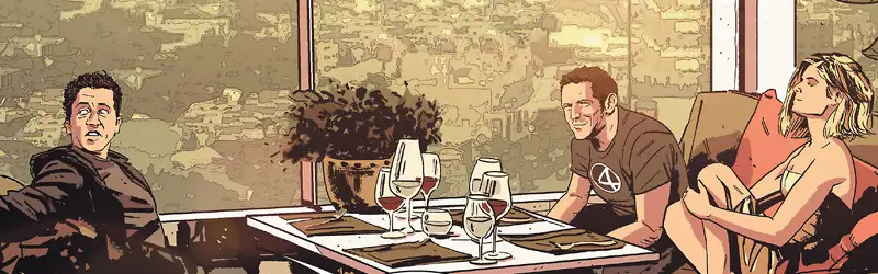 Los actores Miles Teller (que interpreta a Mr. Fantástico), Jamie Bell (La Mole) y Kate Mara (Chica Invisible) son fielmente representados en esta tira cómica, donde se encuentran reunidos en un edificio conversando cuando de repente todo a su alrededor comienza a explotar y volar en mil pedazos.