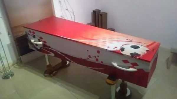 Es un féretro de color blanco con una tapa de color rojo y un balón de fútbol en la parte inferior, así como varios detalles futbolísticos en los costados.