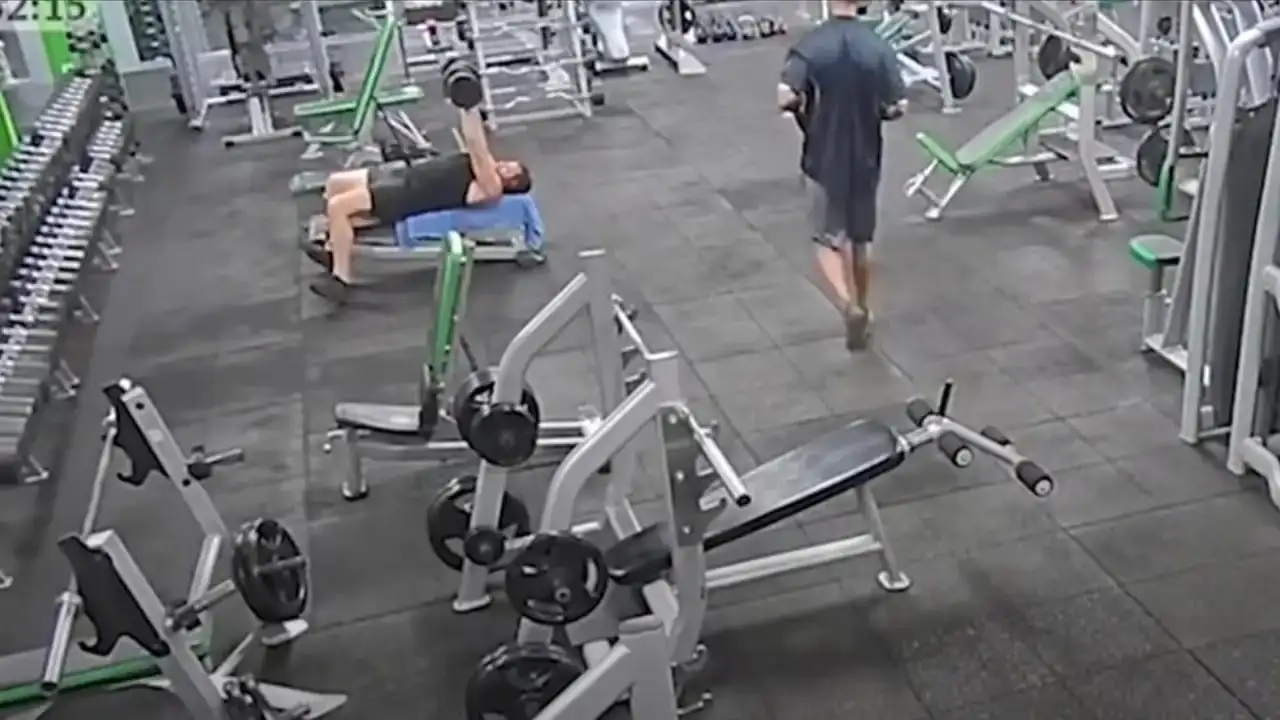 La filmación muestra a Ryan quien recoge un plato de 20 kilogramos y se dirige directamente a su víctima, que estaba recostado sobre una banca mientras levantaba pesas con ambos brazos.