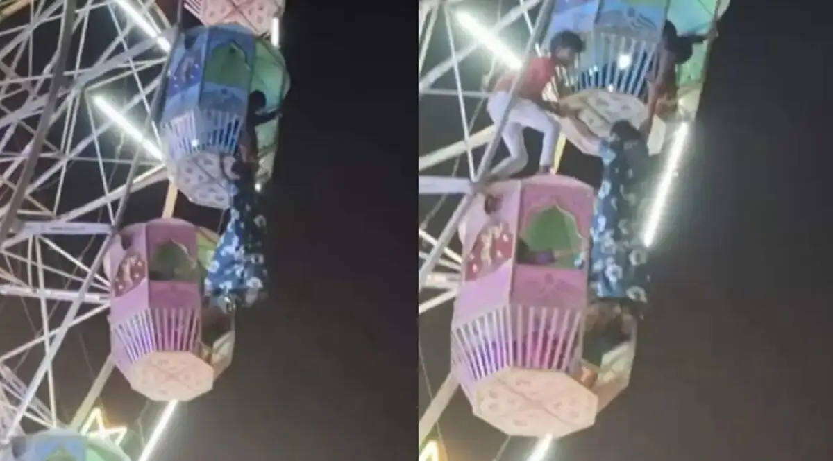 Una mujer, cuya identidad no ha sido revelada, terminó colgando a unos nueve metros de altura tras salirse de una de las cabinas de la rueda de la fortuna que formaba parte de una feria en el estado de Chhattisgarh, en India.