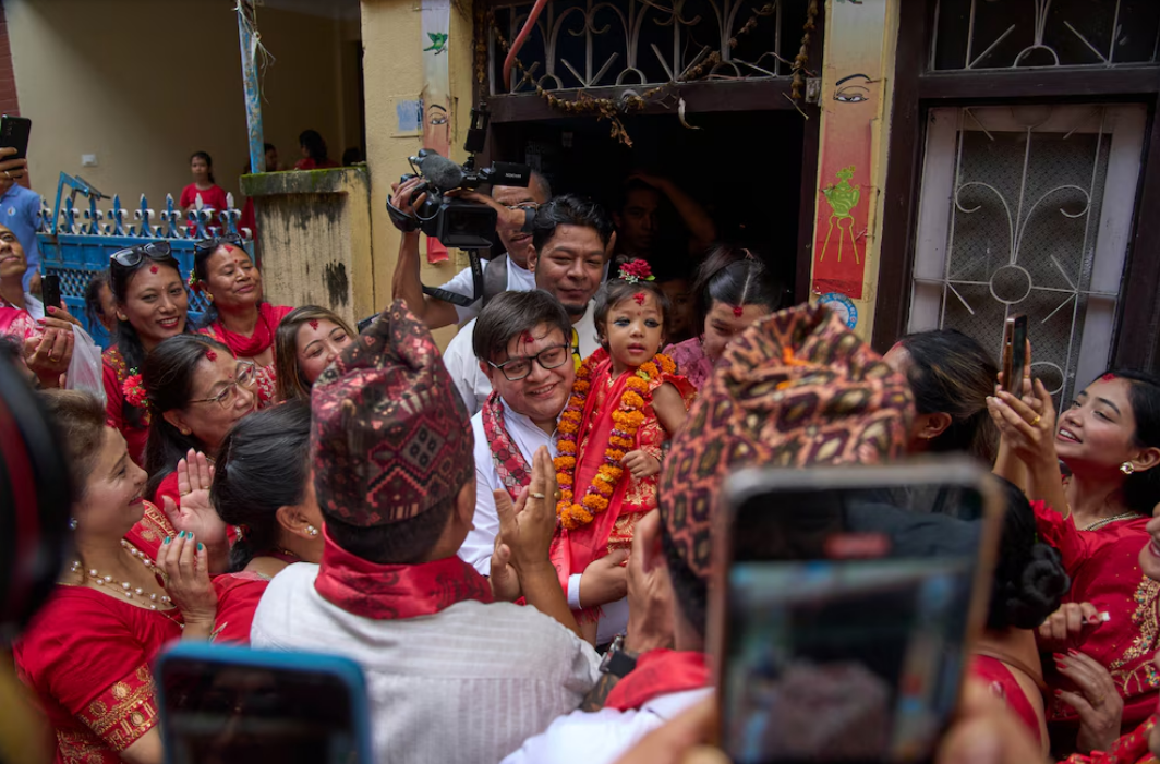 Familiares, amigos y devotos desfilaron a la nueva Kumari por las calles de Katmandú antes de ingresar al palacio del templo que será su hogar durante varios años.