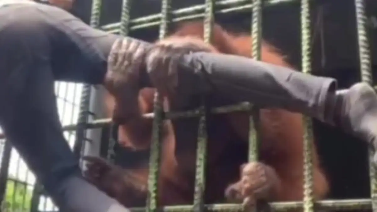 El muchacho ingresó a un área prohibida del zoológico Kasan Kulim para grabarse mientras estaba muy cerca de la jaula de la orangutana «Tina», quien logró agarrarlo violentamente de su camisa.