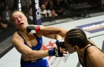 Con Rousey contra la reja, el referí Herb Dean no tuvo más remedio que ponerle fin a la masacre, una que concluyo con apenas segundo de haber iniciado la pelea.