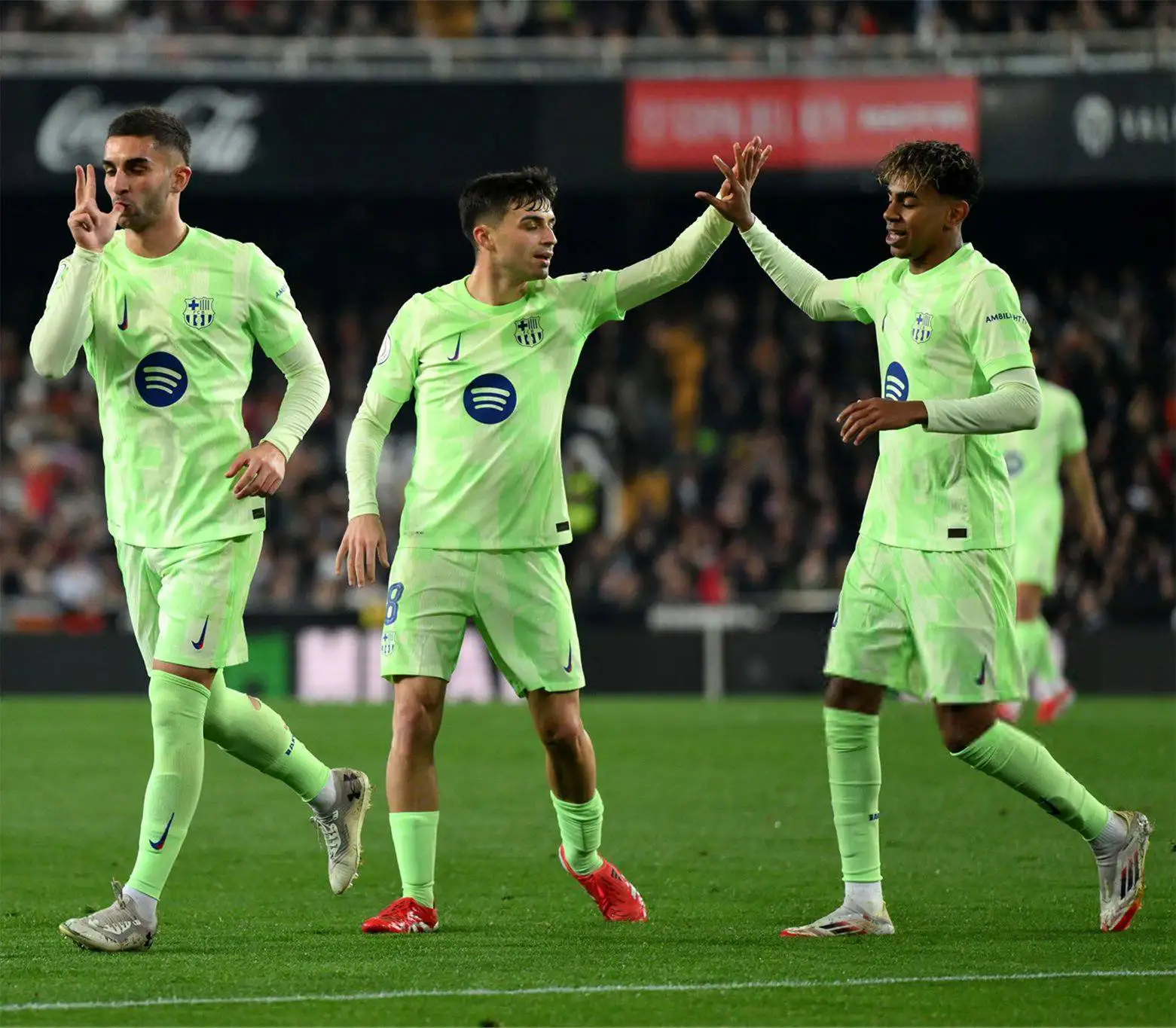 En la victoria Culé, Ferran Torres, anotó tres goles, el primero en el minuto 3, el segundo en el 17 y el tercero en el 30, Fermín López y Yamime Yamal, completaron la goleada.