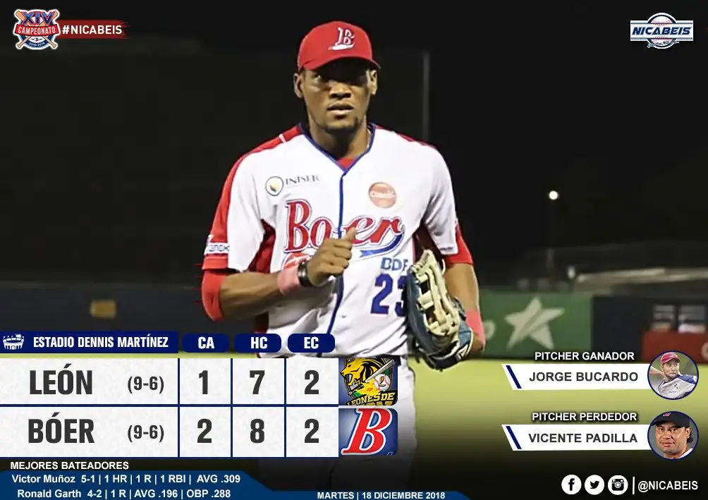 Con esta victoria el boer empata el liderato de la liga profecional de béisbol con valance de nueve victoria y seis derrota con el equipo de León.