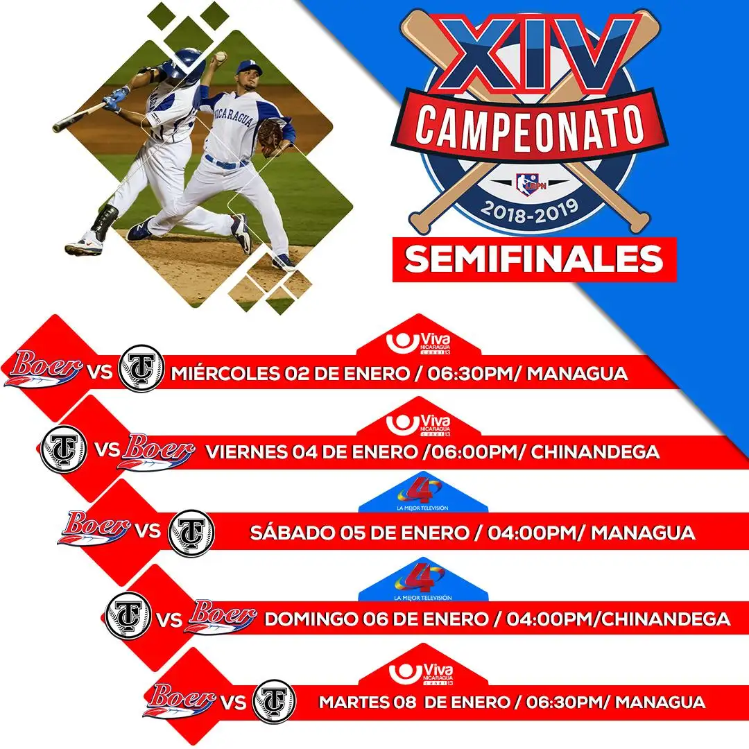La serie semifinal arranca hoy miércoles en Managua a las 6:30 pm, el jueves hay descanso, para después tener tres juegos de manera consecutiva, viernes en el estadio Efraín Tijerino de Chinandega a las 6pm, sábado en Managua (4pm) y el domingo regresa la seria a Chinandega 4pm. El quinto y último partido de la serie de ser necesario se jugara en Managua el martes (6.30pm).