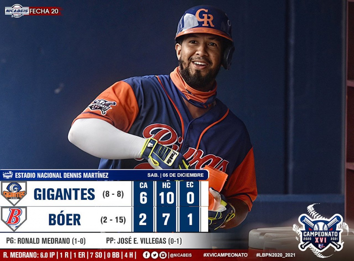 Con estos resultados los Gigantes de Rivas quedaron con récord de 8-8 y los Indios del Boer con 2-15.