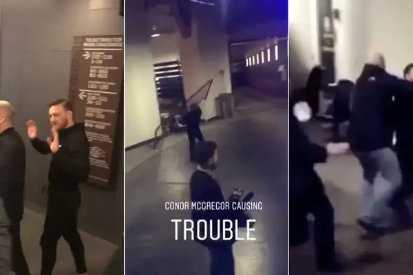 Las imágenes filtradas e Internet a un McGregor muy «endiablado» mientras toma varios objetos, incluyendo una enorme valla de seguridad, y la lanza contra el autobús de Khabib. En el hecho resultó herido el luchador Michael Chiesa quien resultó cortado producto de los vidrios destrozados.
