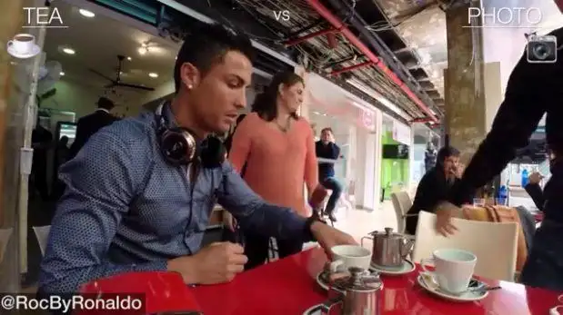 Una cámara de video de la firma ROC Live Life Loud registró lo que ocurre cuando a Cristiano Ronaldo se le antoja tomar un té. Aquí se ve claramente cómo la estrella del Real Madrid, quien llega con un amigo a un café de Madrid, debe tener una paciencia de acero ante los múltiples pedidos de fotografías y selfies de todos sus admiradores.