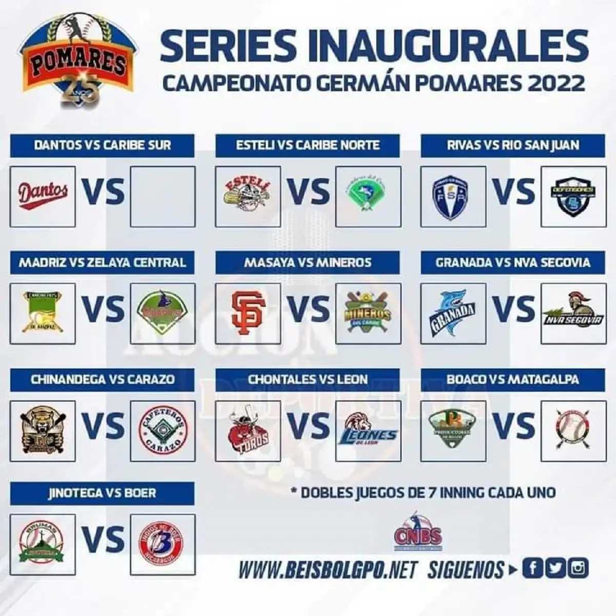 Los Tiburones de Granada jugarán ante Nueva Segovia, los Tigres de Chinandega debutarán ante Carazo, los Toros de Chontales ante León, los Productores de Boaco ante los Indígenas de Matagalpa y los Indios del Bóer ante las Brumas de Jinotega.
