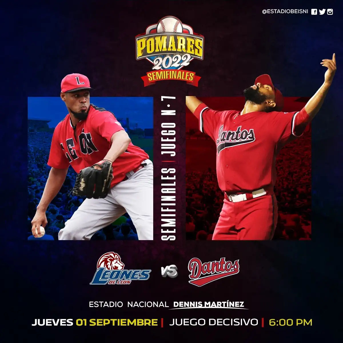 Los Leones de León y Los Dantos jugarán este jueves el séptimo y definitivo partido de la ronda semifinal del campeonato nacional de béisbol German Pomares 2022.