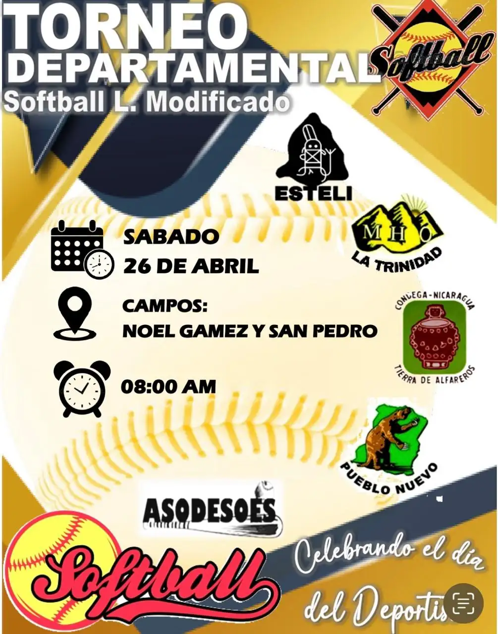 El próximo 26 de abril en la ciudad de Estelí, se estará realizando el campeonato departamental de softbol lanzamiento modificado masculino, con la participación de Estelí, Condega, Pueblo Nuevo y La Trinidad.