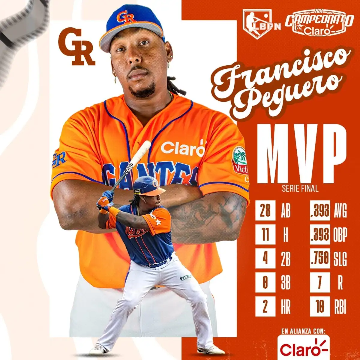 Peguero con experiencia en Grandes Ligas, bateó 11 imparables, entre ellos cuatro dobles, dos cuadrangulares, anotó siete carreras e impulsó diez para ser electo como el más valioso de la final.