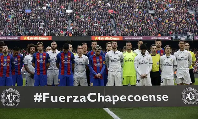 En el clásico entre Barcelona y Real Madrid, uno de los partidos de fútbol más vistos del mundo, ambos equipos hicieron un homenaje al Chapecoense en pleno césped del Camp Nou. Los futbolistas posaron con una pancarta negra con la leyenda “Fuerza, Chape” y los escudos del club.