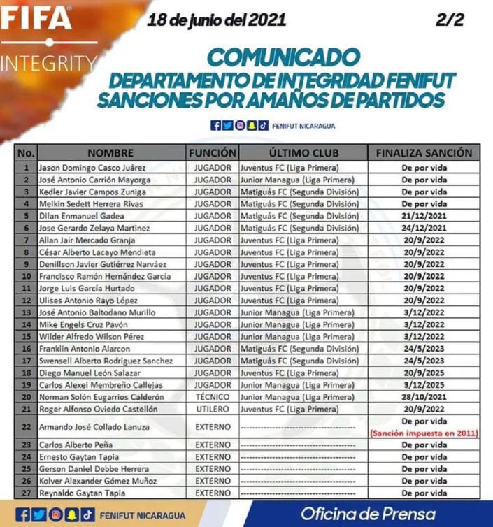 Casco (Club Juventus de primera división), Carrión (Junior de Managua de primera división), Campos y Herrera del Club Matiguas F.C de la segunda división, fueron sancionados de Por Vida por la Fenifut.