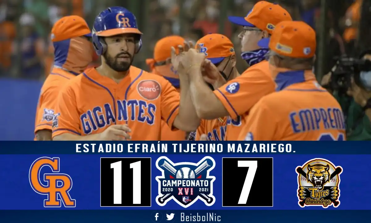 Los Gigantes de Rivas derrotaron 11-7 a los Tigres de Chinandega y se colocaron a una victoria del título de la liga nicaragüense de béisbol profesional .