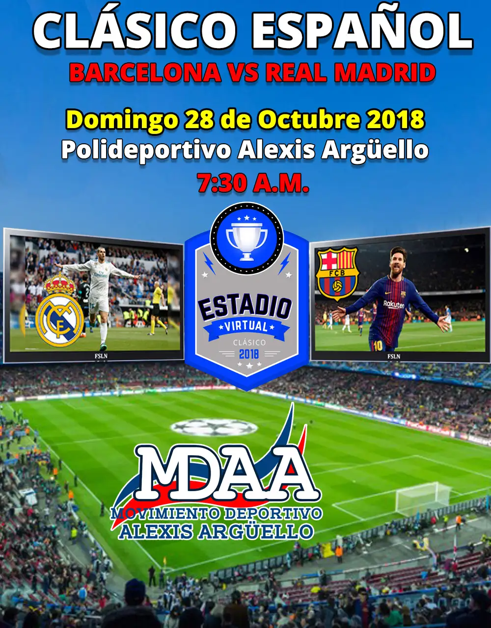 La Juventud Sandinista 19 de julio organizará un estadio virtual en el Polideportivo Alexis Argüello, para presentar en pantalla gigante el clásico del fútbol español entre Real Madrid y Barcelona, programado para las 9:15 de la mañana del próximo domingo.