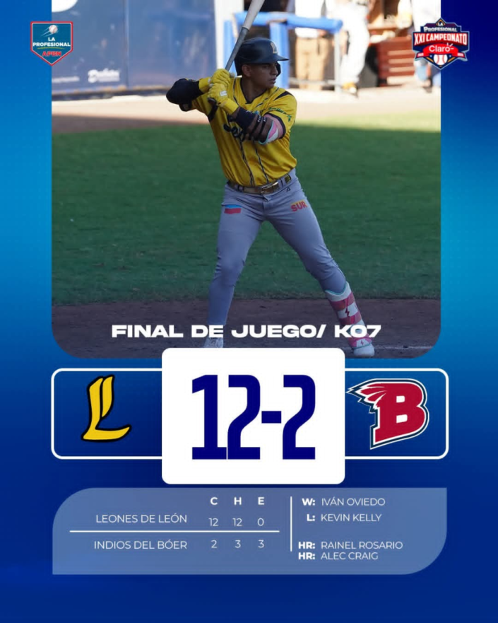 Los Leones de León vencieron por nocauts en siete episodios 12-2 a los Indios del Boér, la tarde de este sábado en la continuación de la Profesional de Béisbol y en transmisión de Tu Nueva Radio Ya.
