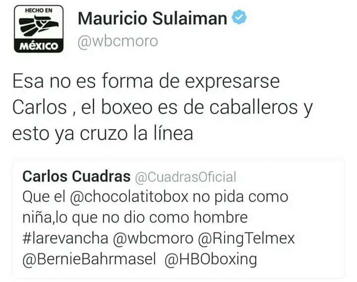 El presidente del Consejo Mundial de Boxeo, Mauricio Sulaimán, expresó este viernes su inconformidad por un tuit que escribió el mexicano Carlos Cuadras en su cuenta personal en contra del pugilista pinolero Román «Chocolatito» González.