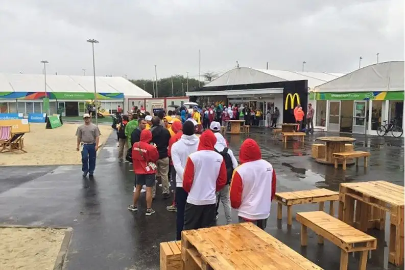 La empresa transnacional de hamburguesas McDonald’s, ofreció comida gratis para los atletas dentro de la Villa Olímpica en Brasil que participan en los juegos olímpicos, Rio-2016.