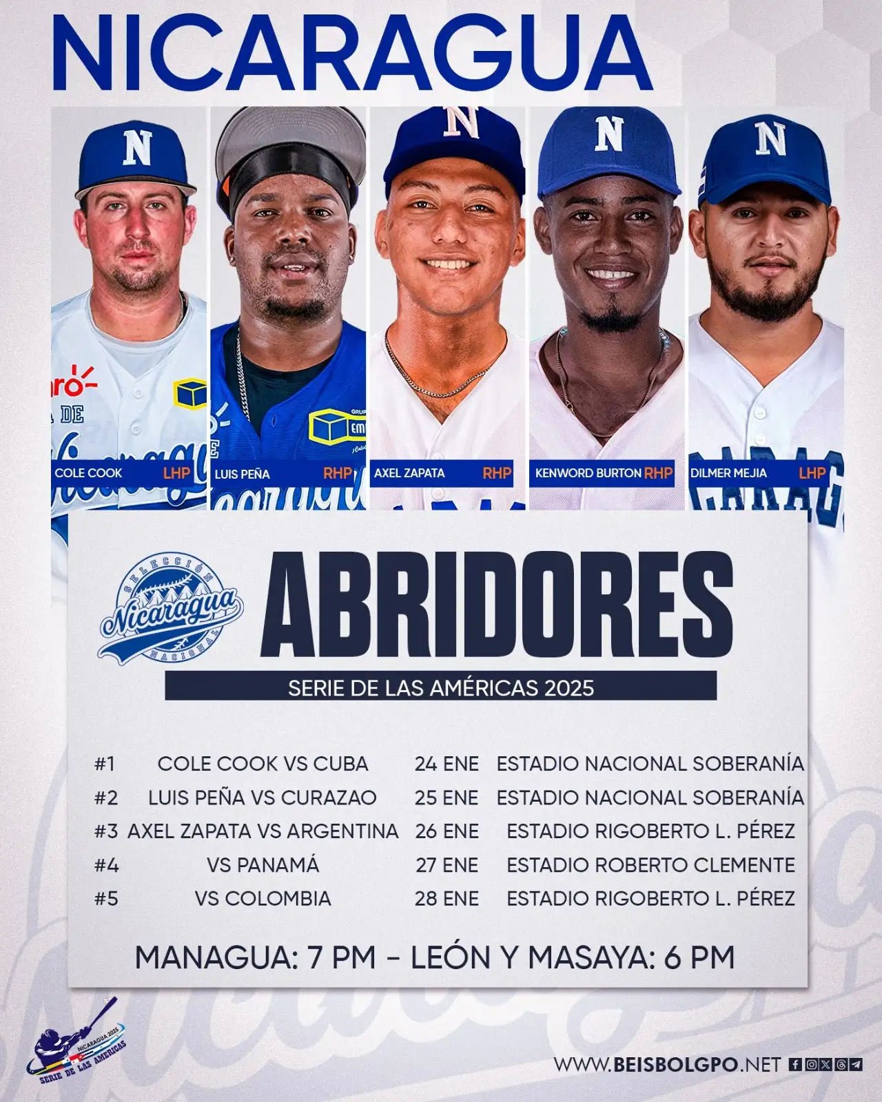 En el partido entre Cuba y Nicaragua el picher abridor pinolero será Cole Cook, según informó el manager, el encuentro será el viernes a las siete de la noche en el estadio Soberanía, de Managua.