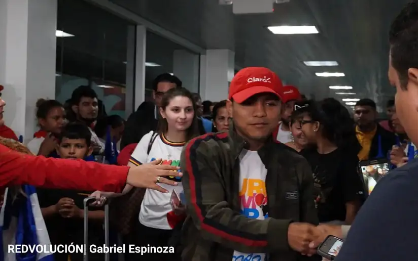 El pugilista fue recibido en la terminal aérea del Aeropuerto Internacional “Augusto C. Sandino” por el pueblo nicaragüense, Juventud Sandinista y sus familiares.
