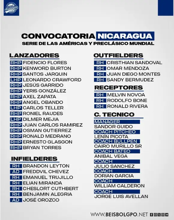 Esta mañana se dieron a conocer los nuevos convocados para el equipo nacional que nos estará representando, los nuevos peloteros son; Bryan Torres, Carlos Teller, Dilmer Mejía, Ernesto Glasgon, Juan Carlos Ramírez, Osman Gutiérrez, Ronald Medrano, Benjamín Alegría, José Saúl Orozco, Juan Diego Montes y Sandy Bermúdez,