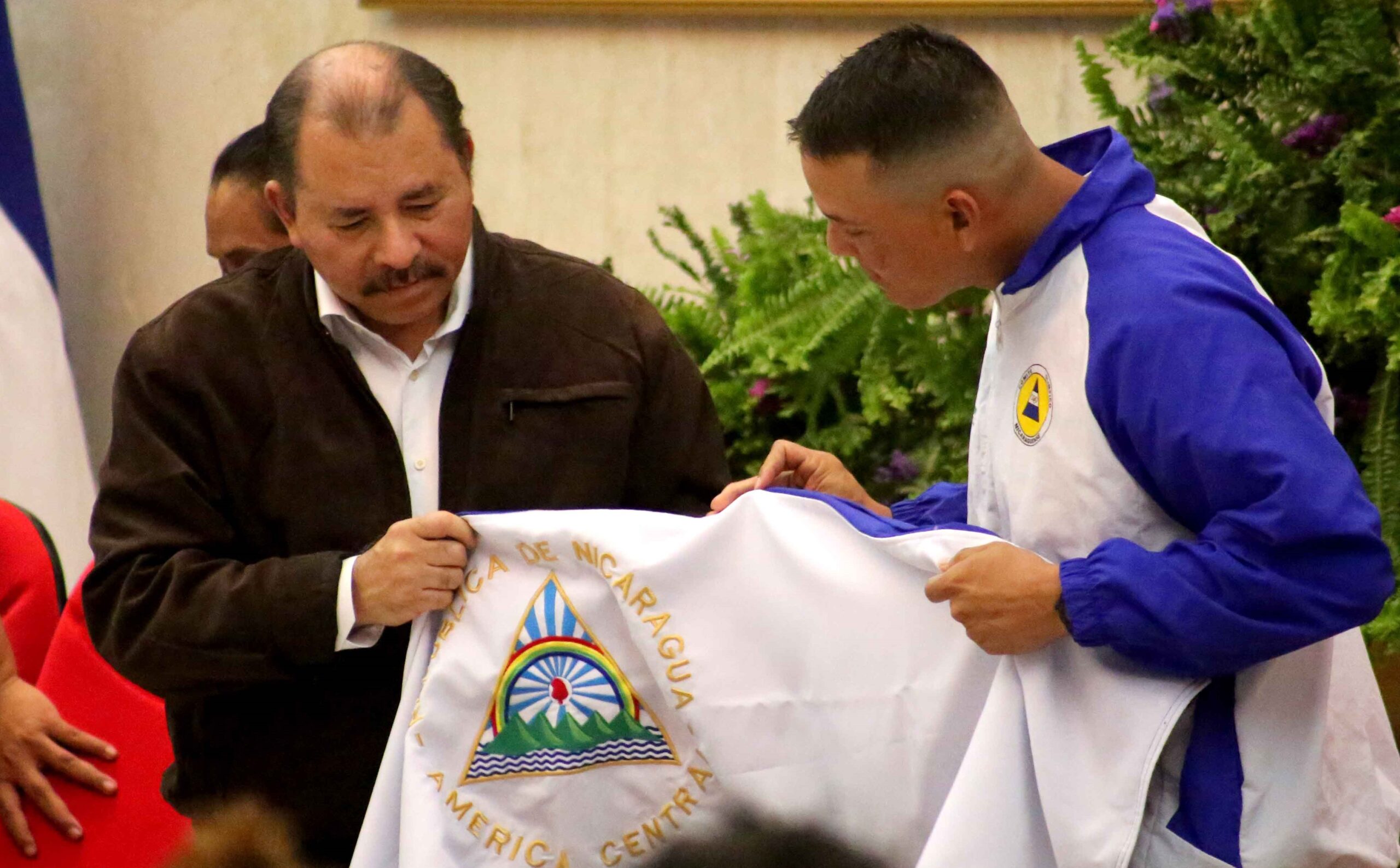 Durante el acto que se realizó en el Salón de los Cristales, del Teatro Nacional “Rubén Darío”, el Comandante Daniel entregó el pabellón nacional al pelotero Sandor Guido, abanderado de los juegos.