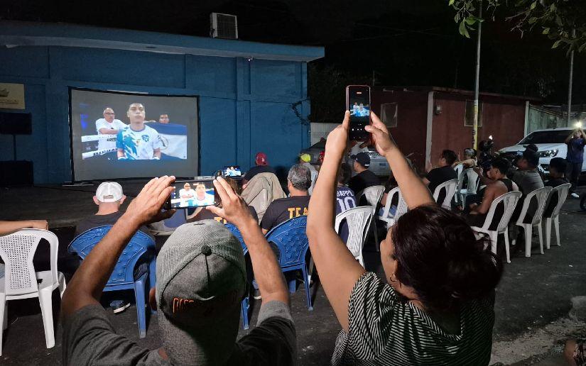 En pantalla gigante, familias del barrio María Auxiliadora de Managua, apoyaron a los boxeadores nicaragüenses Jordan “La Cobrita” Orozco y Alex Vallecillo, quienes pusieron en alto el nombre de Nicaragua con su desempeño en el cuadrilátero, durante sus pelas realizadas esta noche en Estados Unidos.