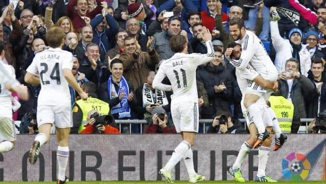 El líder dominó el encuentro jugado en el estadio Santiago Bernabéu de inicio a fin y se puso en ventaja con rapidez. A los 12, Bale lanzó un preciso cambio de frente para Cristiano Ronaldo, quien habilitó de primera para que Rodríguez abriera la cuenta.