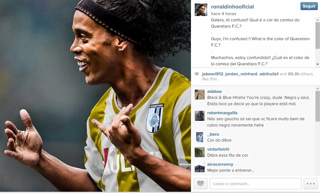 «Muchachos, estoy confundido ¿Cuál es el color de la camisa del Querétaro F.C.?», escribió el jugador, lo que provocó risas y todo tipo de comentarios en su publicación en las redes sociales.