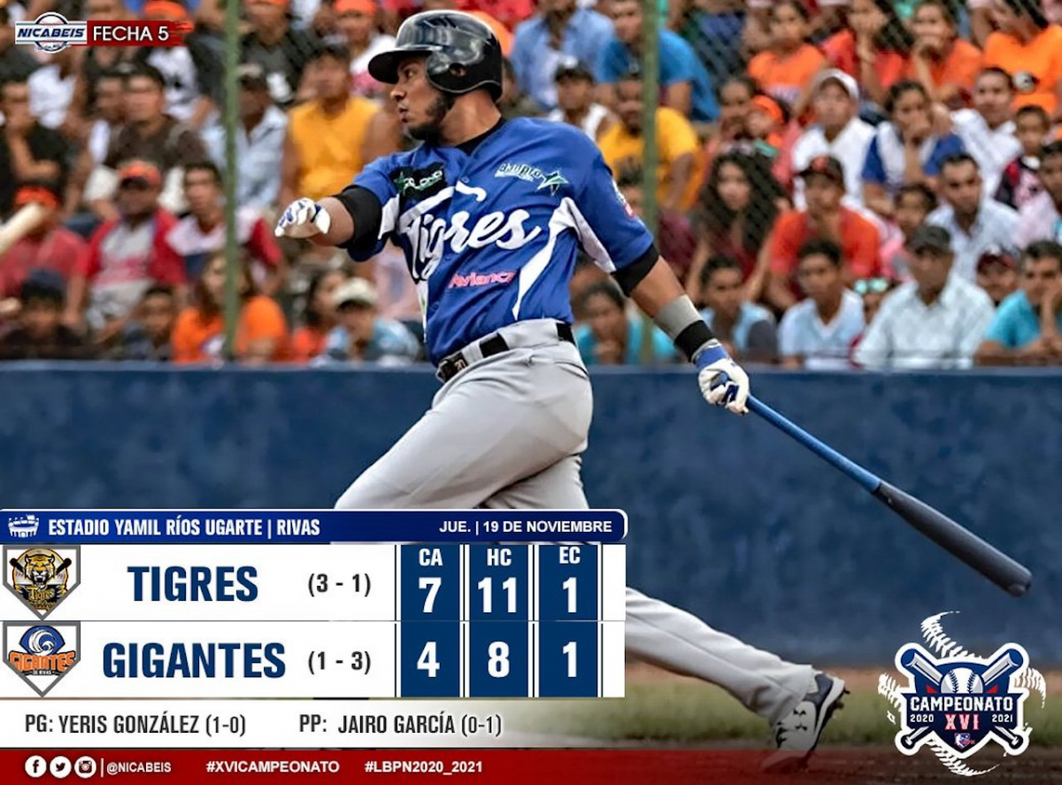 Con un rally de 5 carreras en la parte alta de la novena entrada, los Tigres de Chinandega derrotaron 7-4 a los Gigantes de Rivas, en la continuación de la Liga Nicaragüense de Béisbol Profesional.