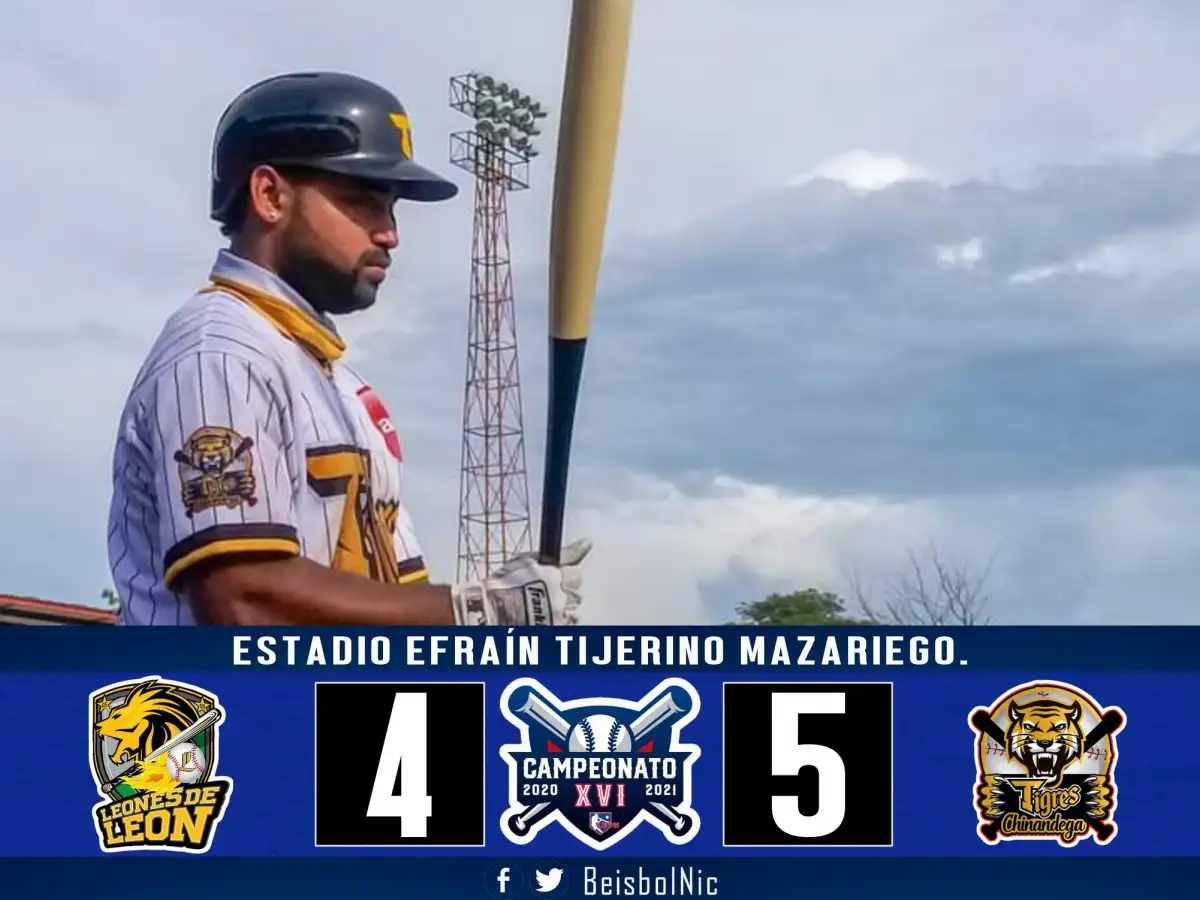 Los Tigres de Chinandega derrotaron 5-4 a los Leones de León y son líderes con balance de 2-0 en la segunda ronda de la Liga Nicaragüense de Béisbol Profesional.