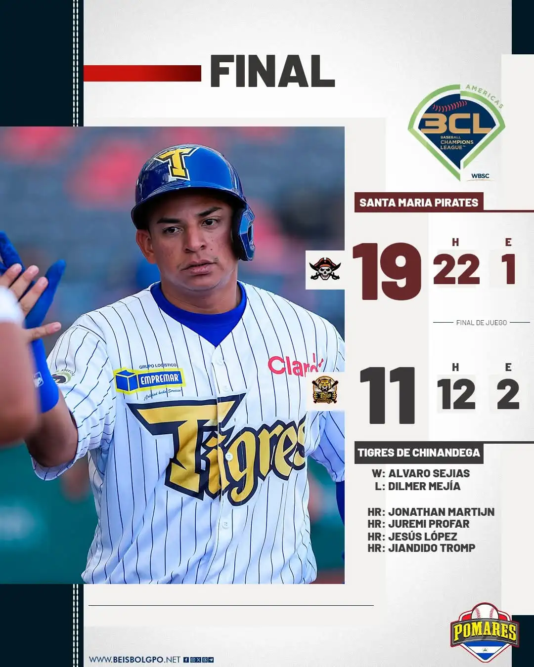 Los Tigres de Chinandega concluyeron su participación en el Champions de Béisbol, tras caer con marcador 19-11 ante los Piratas de Santa María, de Curazao, la tarde de este viernes.