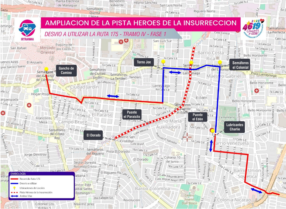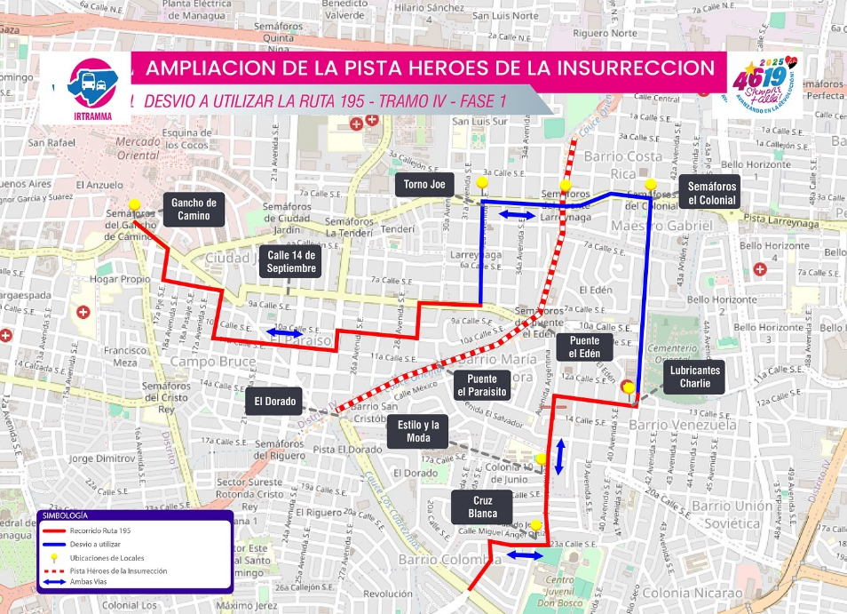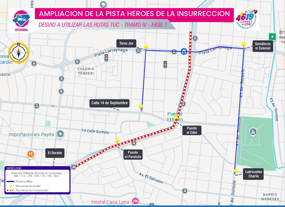 La ruta alternativa incluye avanzar siete cuadras al norte hasta los semáforos del Colonial, cruzar el Puente Larreynaga en sentido Este–Oeste, pasar frente a Sellos Davinci hasta El Torno Joe, y girar a la izquierda para retomar su ruta habitual en la calle 14 de Septiembre.