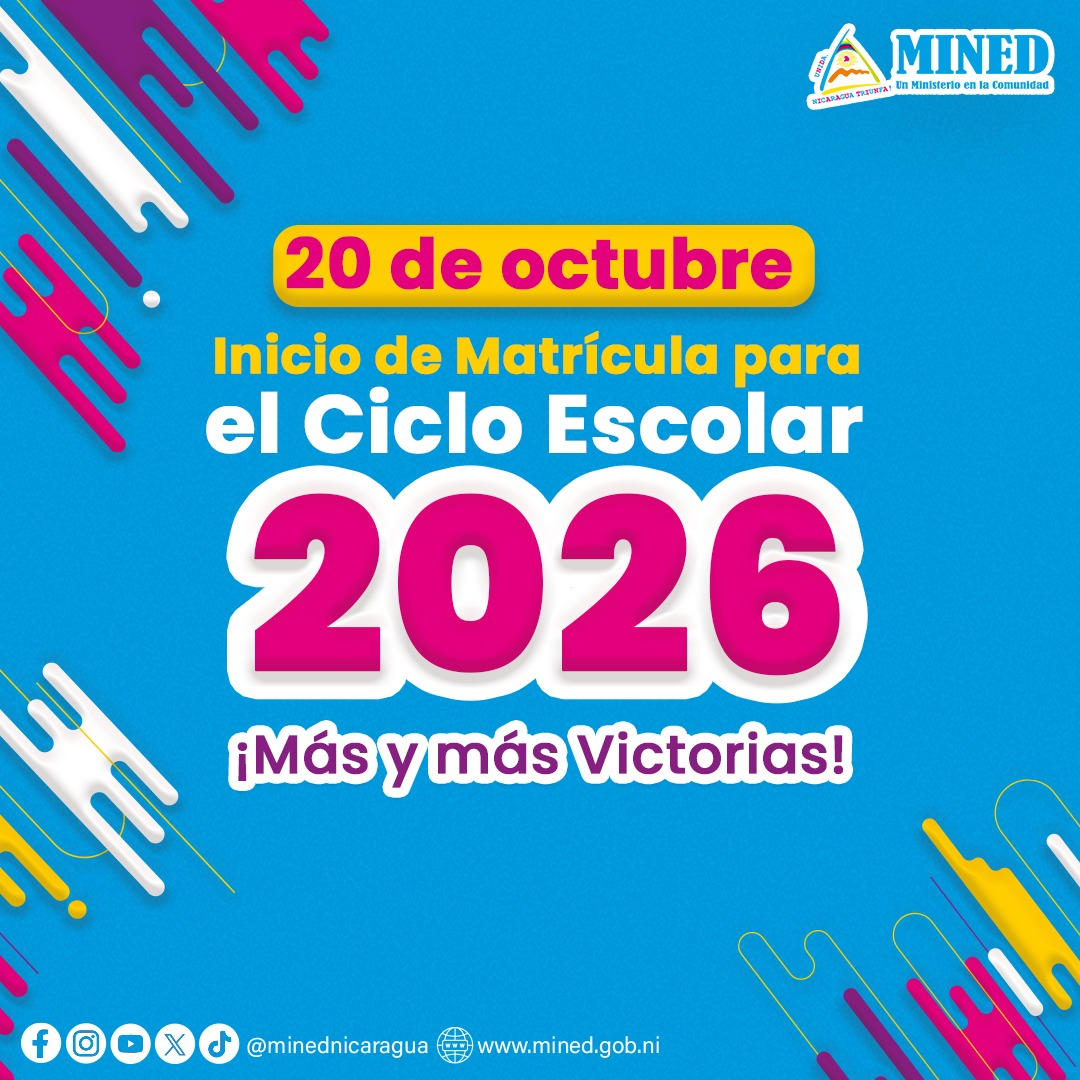 Este lunes 20 de octubre el Ministerio de Educación (MINED) inicia el período de inscripciones para la matrícula escolar 2026, con el fin de garantizar el acceso a la educación a más de 1.8 millones de estudiantes en todo el país.