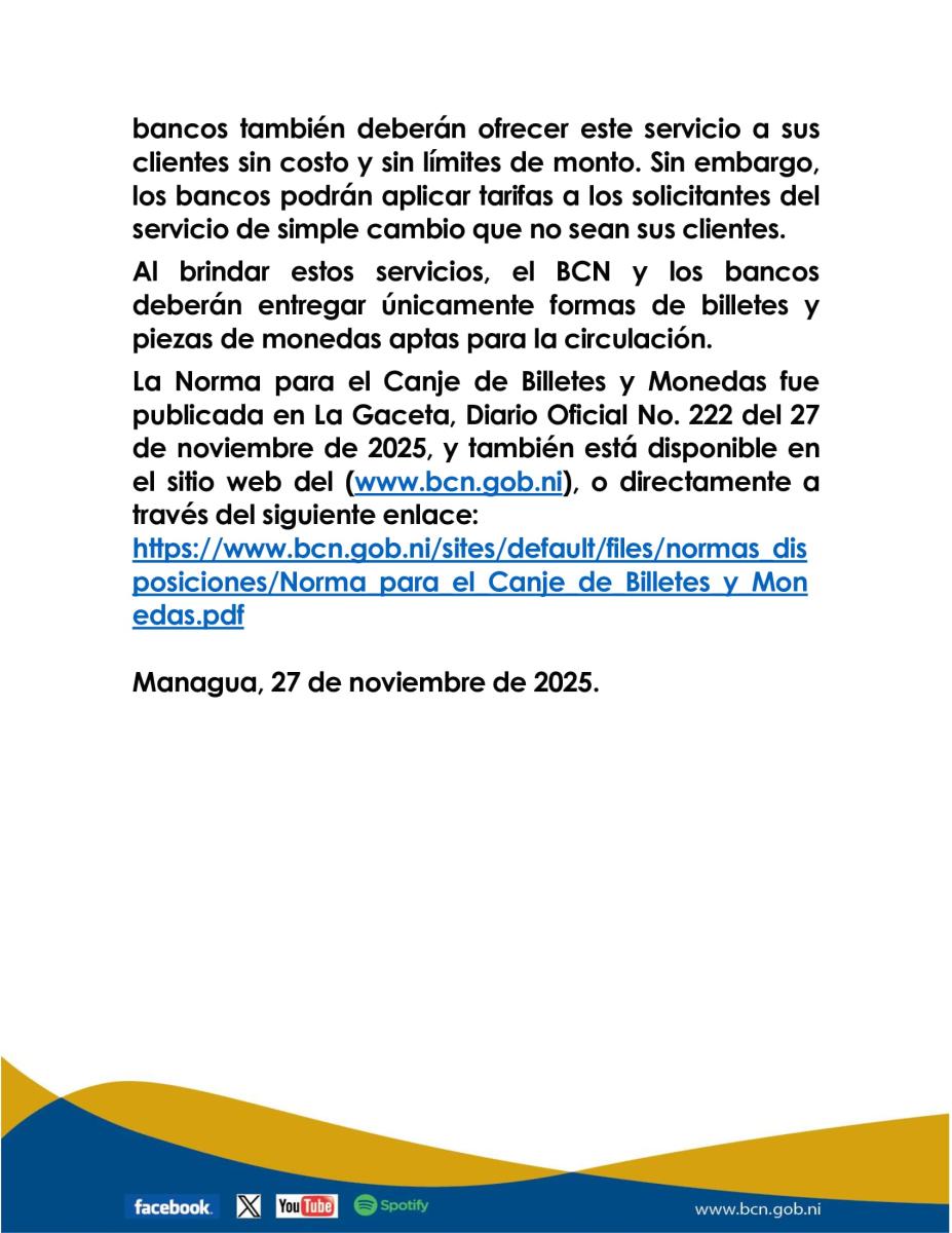 La Norma para el Canje de Billetes y Monedas fue publicada en La Gaceta, Diario Oficial No. 222 del 27 de noviembre de 2025, y también está disponible en el sitio web del (www.bcn.gob.ni).