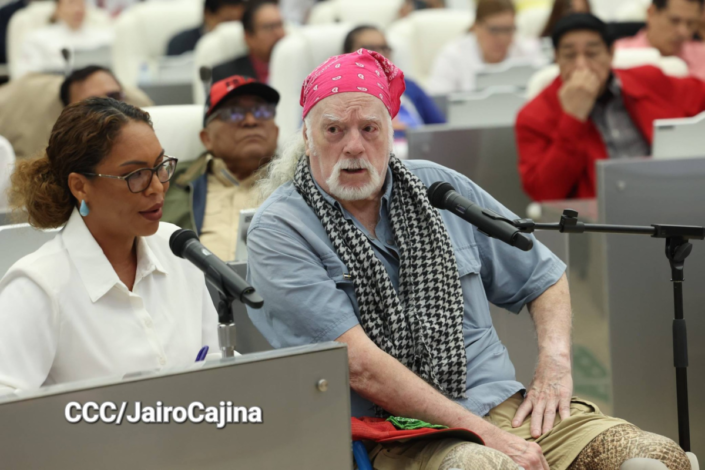 Wilson, veterano de la Guerra de Vietnam convertido en activista por la paz, compartió su testimonio ante los diputados sobre cómo Nicaragua transformó su vida y su lucha contra el imperialismo estadounidense.