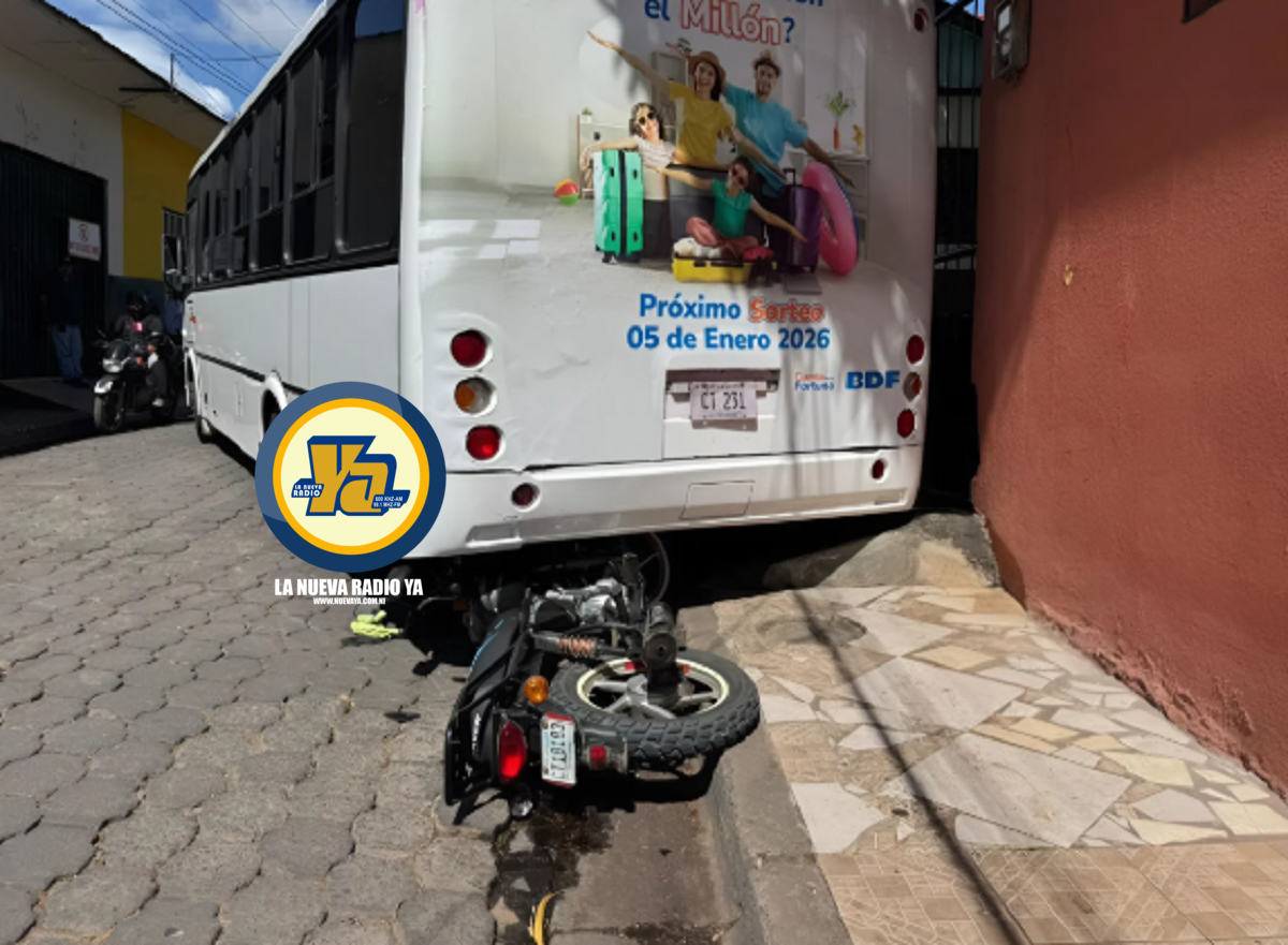 El motociclista Javier Suárez Salomon y otra persona que lo acompañaba resultaron golpeados al ser atropellados por un bus que se fue hacia atrás en la esquina de la CST en Juigalpa, Chontales.