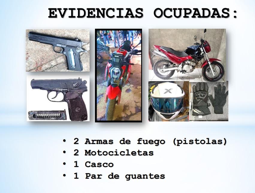 Durante la captura de Martínez y García, la Policía ocupó dos armas de fuego tipo pistola y dos motocicletas utilizadas para la comisión del delito, además de un casco y un par de guantes.