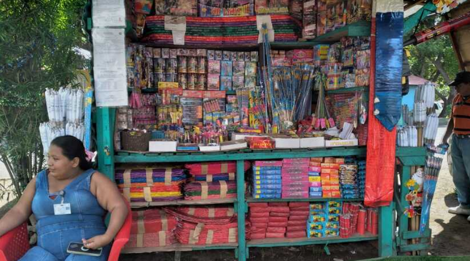 Maritza Guevara Rodríguez dijo que en su puesto de pólvora ofrece de todo: «Hay bombas, carga cerrada, hay lloronas y fuegos artificiales para niños».
