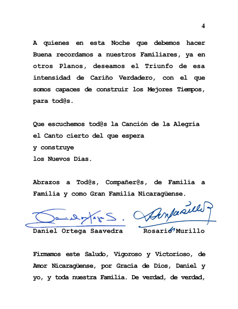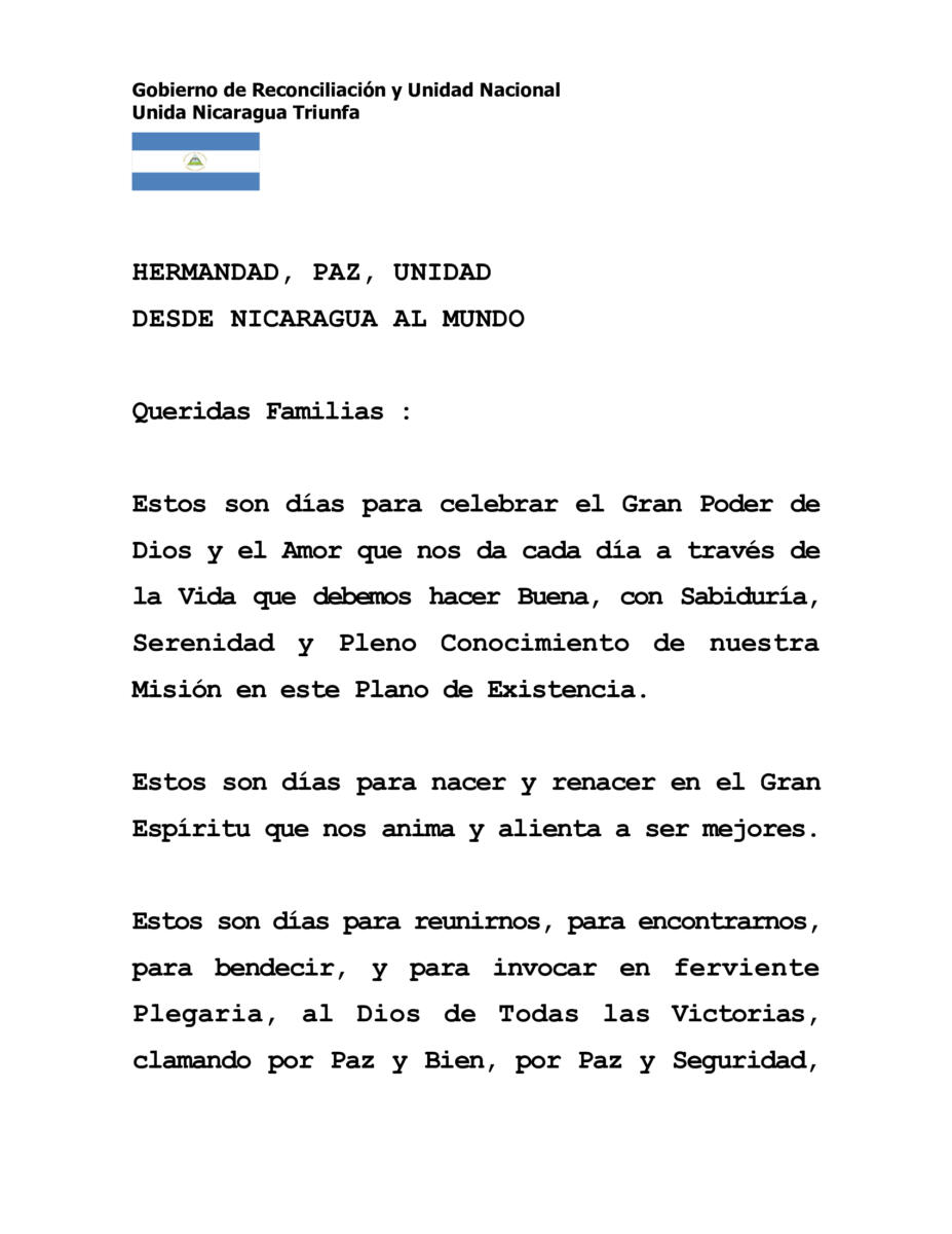 Con motivo de las celebraciones navideñas, el Copresidente Comandante Daniel Ortega, CoPresidenta Compañera Rosario Murillo y toda la familia, enviaron un mensaje al pueblo nicaragüense y a las familias del mundo, haciendo un llamado a la hermandad, la paz y la unidad, desde Nicaragua al Mundo.
