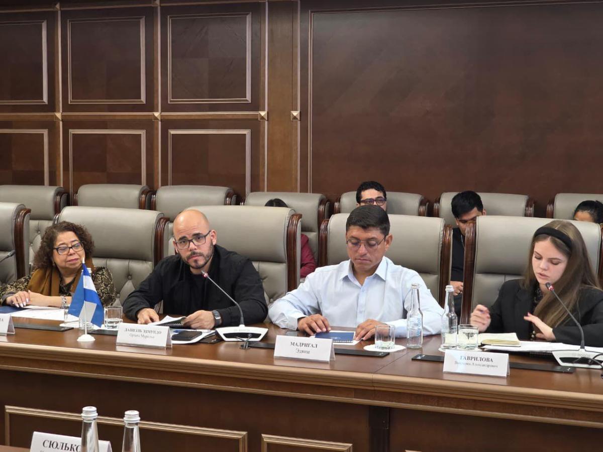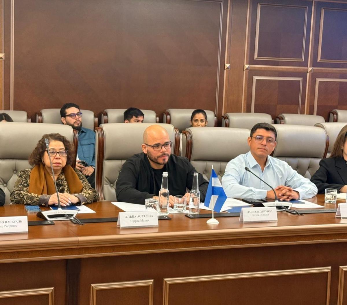 La Delegación del Pueblo y Gobierno de Nicaragua que visita la Federación de Rusia está integrada por el Compañero Daniel Edmundo Ortega Murillo, Coordinador de Medios del Consejo de Comunicación y Ciudadanía; el Compañero Edwin Madrigal, de la Red de Jóvenes Comunicadores de JS19J; el Compañero Camilo Rodríguez, Coordinador de las Plataformas Digitales de Juventud Sandinista; y la Compañera Alba Azucena Torres, Embajadora de Nicaragua en la Federación de Rusia.