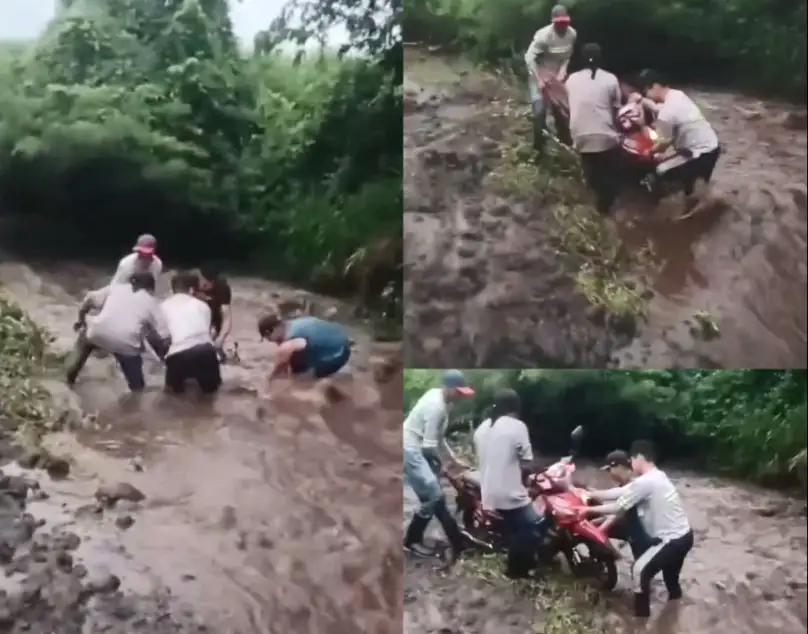 Según reportes de pobladores, los muchachos desafiaron la fuerte corriente, resultando en que su motocicleta fuera arrastrada por la fuerza del agua.
