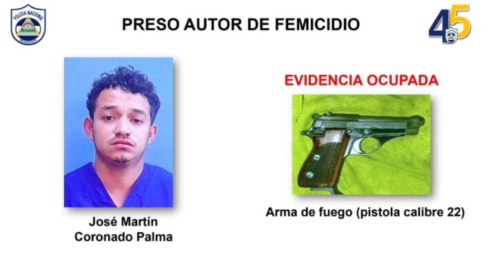 La Policía Nacional presentó este martes en Matagalpa al sujeto José Martín Coronado Palma quien fue capturado por haber asesinado de cinco disparos de arma de fuego a su esposa Rosa Amalia Ruiz González, de 28 años de edad.