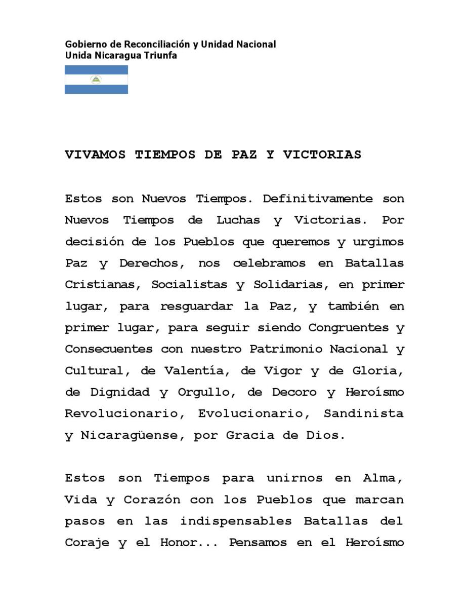 Estos son Nuevos Tiempos. Definitivamente son Nuevos Tiempos de Luchas y Victorias. Por decisión de los Pueblos que queremos y urgimos Paz y Derechos, nos celebramos en Batallas Cristianas, Socialistas y Solidarias, en primer lugar, para resguardar la Paz, y también en primer lugar, para seguir siendo Congruentes y Consecuentes con nuestro Patrimonio Nacional y Cultural, de Valentía, de Vigor y de Gloria, de Dignidad y Orgullo, de Decoro y Heroísmo Revolucionario, Evolucionario, Sandinista y Nicaragüense, por Gracia de Dios.